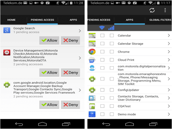 طبعا في البداية يجب اختيار الوضع لكل التطبيق اما بالنسبة للتطبيقات الجديدة ستظهر بالشكل الموضح بالصور ضع allow للسماح و deny للمنع.