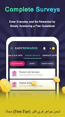 لديك وقت فراغ؟ تتيح لك Easy Rewards كسب نقود وبطاقات هدايا إضافية (فري فاير) من خلال استكمال العروض ببضع نقرات فقط. تتكون العروض من مهام بسيطة مثل تثبيت التطبيقات المجانية وممارسة الألعاب واستكمال الاستطلاعات ومشاهدة مقاطع الفيديو. لكل عرض تكمله، ستحصل على قدر معين من العملات المعدنية داخل التطبيق. يمكن استبدال هذه العملات مقابل PayPal Cash وبطاقات هدايا أخرى حقيقية.