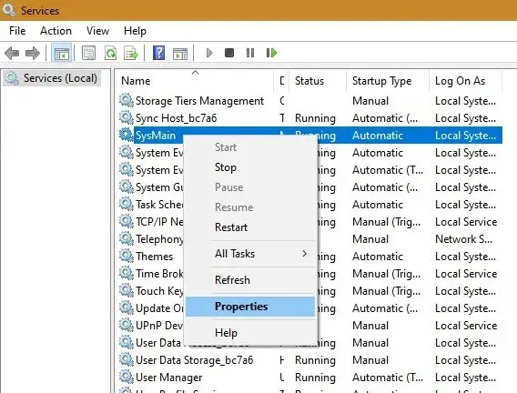 انتقل إلى "SysMain" وانقر بزر الماوس الأيمن لتحديد "خصائص".