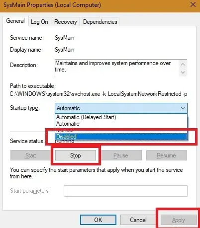 أولاً ، أوقف العملية التلقائية. قم بتعطيل SysMain أثناء بدء التشغيل وقم بتطبيق التغييرات. يتم تعزيز الذاكرة بشكل فوري تقريبًا ، وسيشعر جهاز الكمبيوتر الشخصي الذي يعمل بنظام Windows بشكل أسرع.