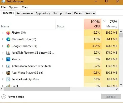 كل ذاكرة الكمبيوتر متصلة بوحدة المعالجة المركزية وذاكرة الوصول العشوائي. ومع ذلك ، فإن مشكلة استخدام الذاكرة العالية ترجع أساسًا إلى الاكتظاظ في العديد من العمليات الداخلية. لذلك ، يساعد في إيقاف البرامج والتطبيقات غير الضرورية التي تعمل. افتح مدير المهام وتحقق من أي برامج إضافية لا تستخدمها الآن. انقر بزر الماوس الأيمن وقم بإنهائها. يجب أن يقلل هذا على الفور من مشكلة استخدام وحدة المعالجة المركزية والذاكرة العالية بنسبة 100٪ .