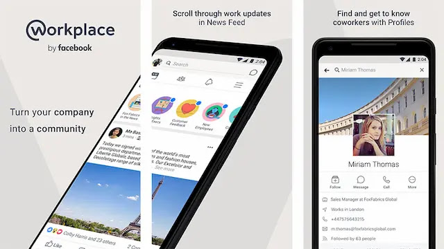 Workplace by Facebook هو رد Facebook على G Suite والخدمات المماثلة. يتيح للشركات وموظفيها التواصل مع بعضهم البعض من خلال مساحات Facebook الصغيرة الخاصة بهم. تتضمن بعض الميزات المكالمات النصية والصوتية ومكالمات الفيديو والمجموعات وتحميلات الملفات والمزيد. Workplace Chat هو تطبيق منفصل في النظام البيئي.