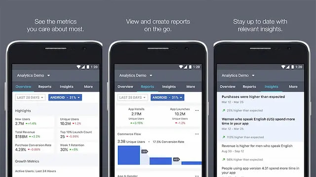 يمكنك التحقق من معدلات التحويل لإعلاناتك ، وإنشاء جميع أنواع التمثيلات المرئية مثل الرسوم البيانية والمخططات ، والحصول على إشعارات عندما يتغير شيء مهم. لا يسمح لك بإدارة أي شيء بشكل مباشر ، لذلك فهو في الغالب لأغراض المعلومات.
