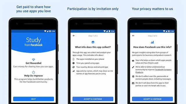 Study from Facebook هو تطبيق حصري لمن يشاركون في برنامج Facebook Study. يتيح للأشخاص الإجابة عن الأسئلة واستخدام التطبيق من أجل أبحاث السوق. يقوم بجمع بيانات مثل التطبيقات المثبتة على هاتفك والوقت الذي تقضيه في كل تطبيق ومكان وجودك وبعض المعلومات الإضافية.