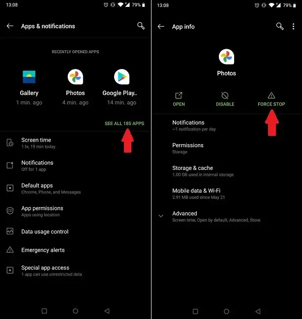 من "الإعدادات -> التطبيقات والإشعارات (أو التطبيقات على الهواتف الأخرى) -> انظر جميع التطبيقات، ابحث عن التطبيق المحدد الذي يسبب مشاكل وانقر فوقه. تحت، ستلاحظ بعض الأزرار / الخيارات. حدد الذي يقول "إيقاف القوة"، ثم العودة إلى التطبيق ومحاولة إطلاقه مرة أخرى.