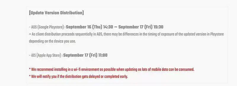 لن تتلقى كلا النظامين (Android و iOS) التحديث في نفس الوقت. وفقًا لإشعار Krafton ، سيعتمد وقت إصدار تحديث BGMI 1.6 أيضًا على الجهاز إلى الجهاز. بالنسبة لمستخدمي iOS ، سيصل التحديث في 17 سبتمبر في تمام الساعة 11:00 صباحًا بتوقيت IST.