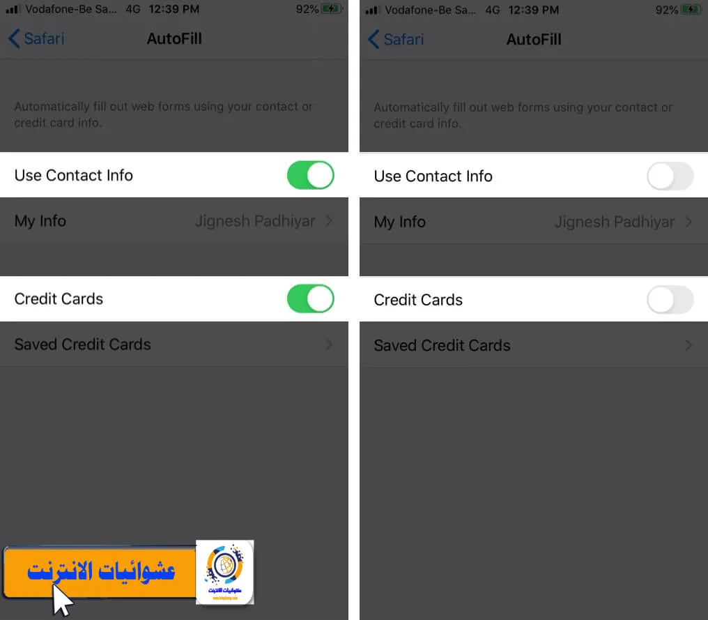 - لإيقاف الملء التلقائي لمعلوماتك الشخصية أو تفاصيل بطاقة الائتمان، في الخطوتين 4 و5، قم بإيقاف تشغيل مفتاح "استخدام معلومات الاتصال" و "بطاقات الائتمان" على التوالي.