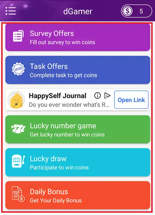 هناك العديد من المهام والاستطلاعات داخل تطبيق dGamer. يمكنك إكمال تلك المهام والاستطلاعات لكسب عملات معدنية يمكن استبدالها لاحقًا مع PUBG UC. تشبه معظم المهام في هذا التطبيق مهام mGamer ، لذا إذا كنت قادرًا على استخدام تطبيق mGamer ، فيمكنك بسهولة كسب كمية ضخمة أخرى من العملات هنا في تطبيق dgamer.