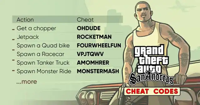 GTA San Andreas Cheat Codes 2023: List of All GTA San Andreas Game Cheats for PC، Xbox & PS لقد حصلنا على قائمة اكواد هكر لـ GTA San Andreas PC والتي ستساعدك في لعب اللعبة. وهنا ايضا مقالة رائعة وهي تتكلم عن كيفية تنزيل GTA San Andreas مجانًا لنظام التشغيل Windows 10.