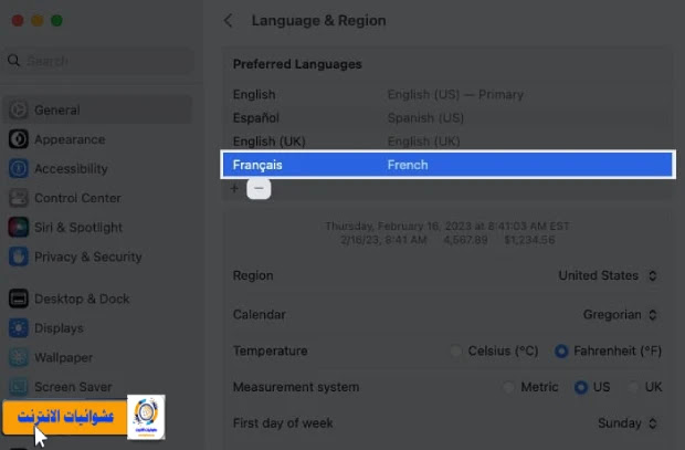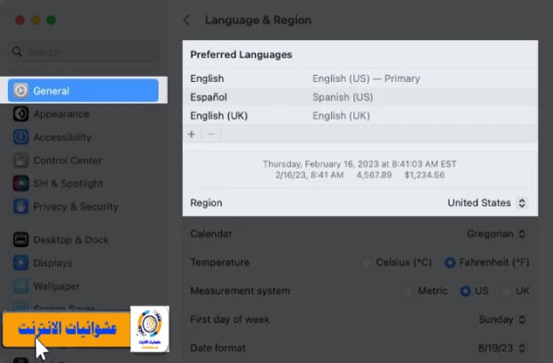 | افتح إعدادات النظام، وانتقل إلى عام، واختر اللغة والمنطقة |