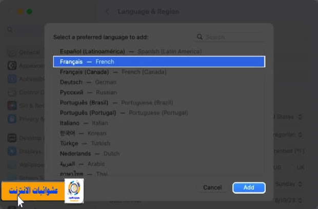 | لإضافة لغة، انقر فوق إضافة في إعدادات النظام |