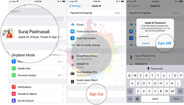 افتح الإعدادات ← ملفك الشخصي ← اضغط على تسجيل الخروج ← أدخل كلمة مرور معرف Apple واضغط على إيقاف في النافذة المنبثقة.
