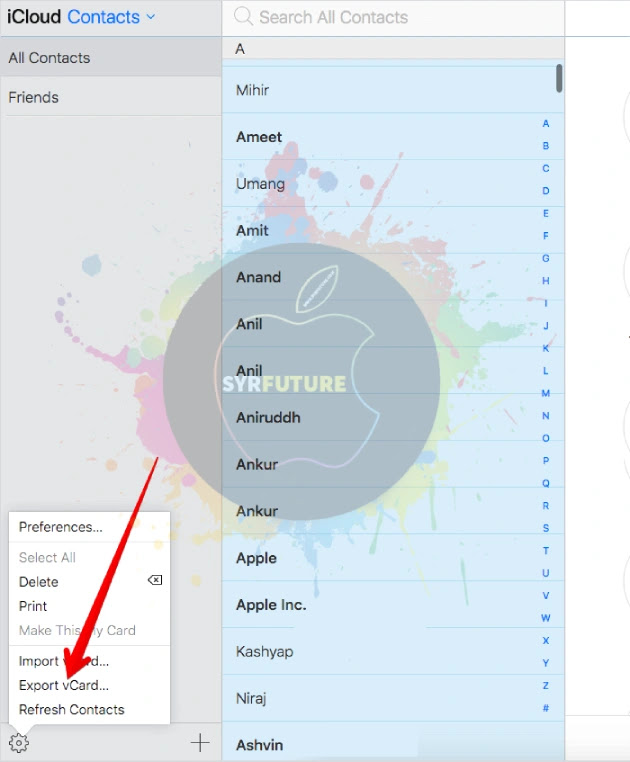 | انقر فوق تصدير vCard في iCloud |