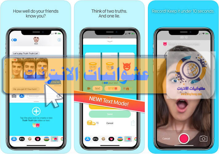 أخبر أصدقاءك بحقيقتين وكذبة ودعهم يفعلون نفس الشيء. خمن أي العبارات صحيحة وأيها خداع. استمتع بهذه اللعبة مع أصدقائك من خلال محادثات iMessage واستكشف بعض الحقائق الممتعة والممتعة عن أصدقائك. أنت لا تعرف أبدًا الأسرار التي قد يكشفونها.