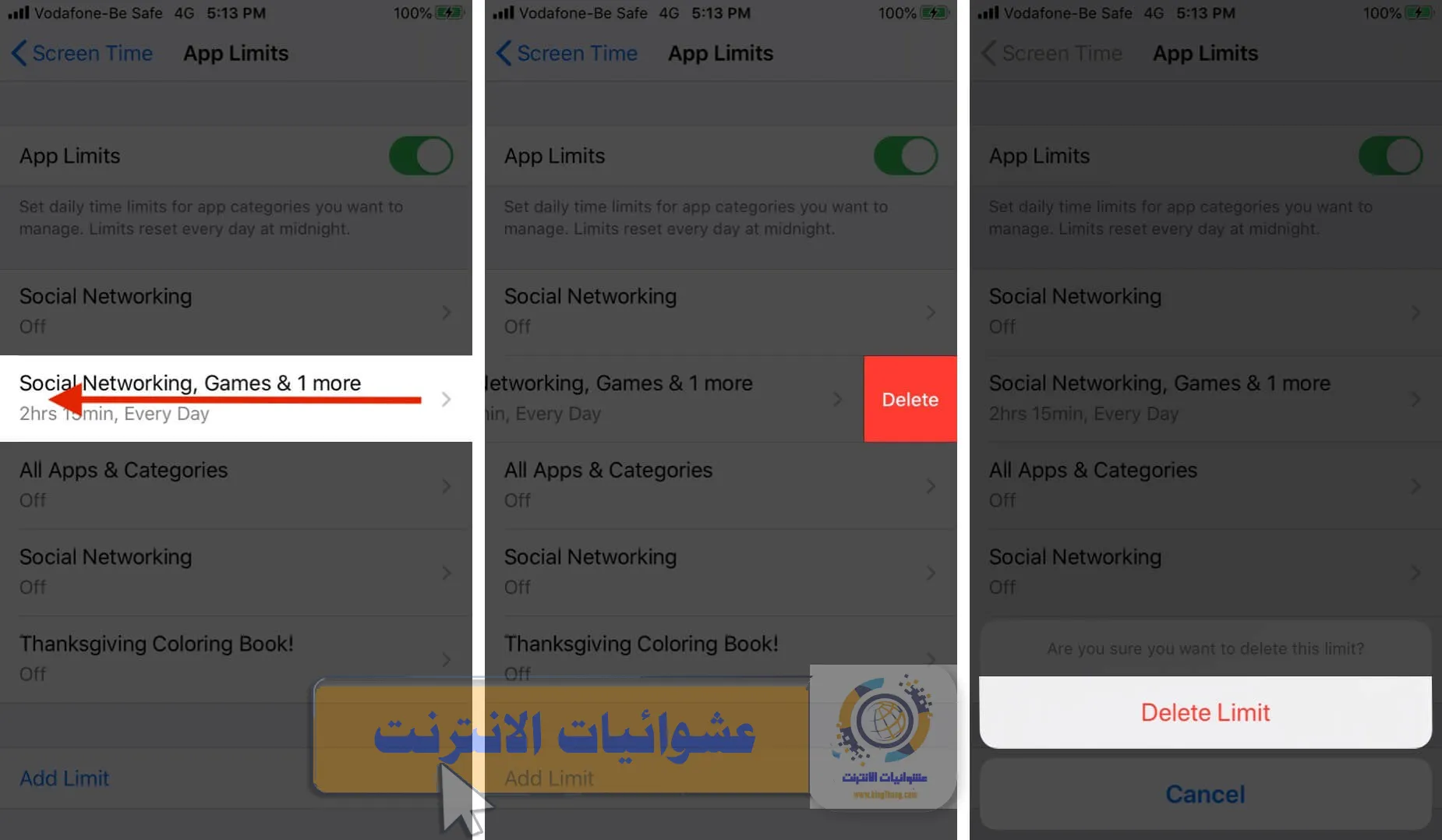 لحذف حد التطبيق: اسحب من اليمين إلى يسار التطبيق من شاشة حدود التطبيق، ثم انقر فوق حذف. أدخل رمز مرور مدة استخدام الجهاز، ثم اضغط على "حذف الحد".