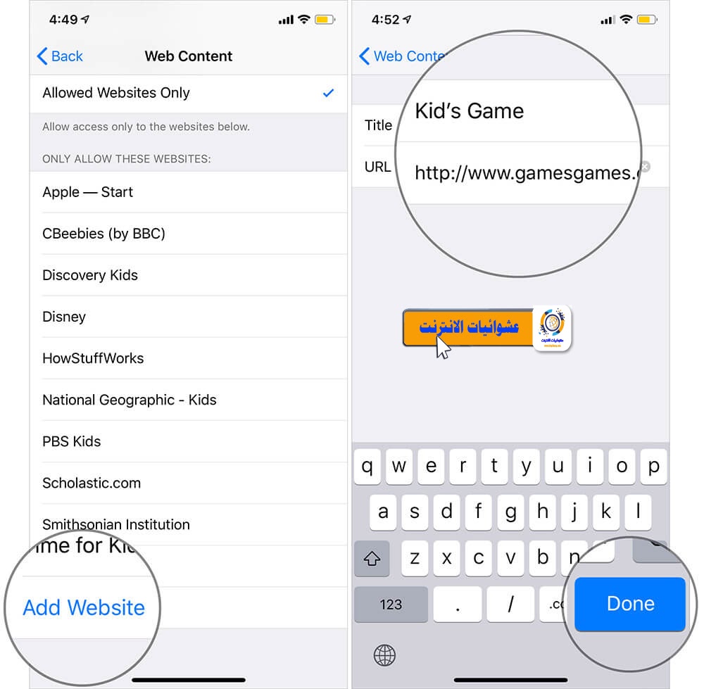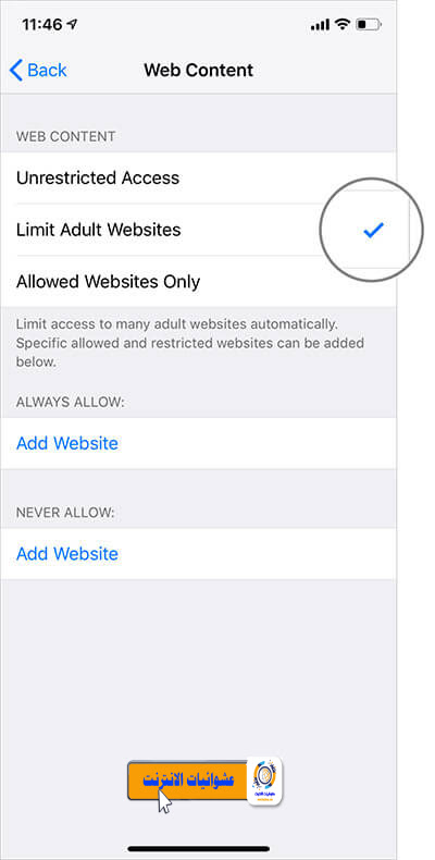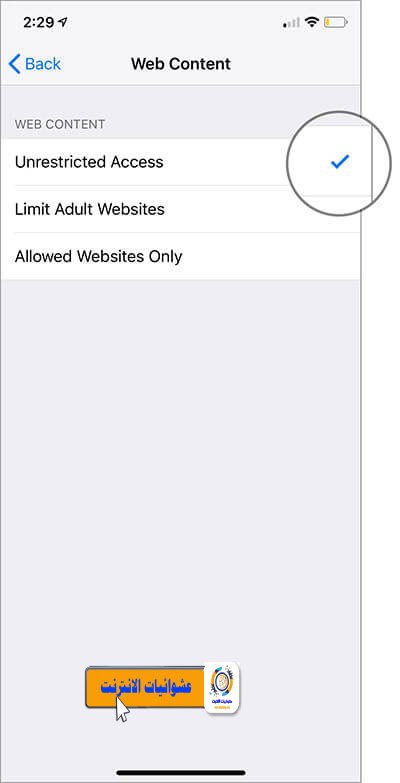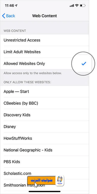 المواقع المسموح بها فقط: إذا كنت ترغب في السماح بالوصول إلى مواقع الويب المحددة فقط، فانقر على مواقع الويب المسموح بها فقط. الآن، من المفترض أن ترى أسماء بعض مواقع الويب مثل Apple-Start وDisney والمزيد.