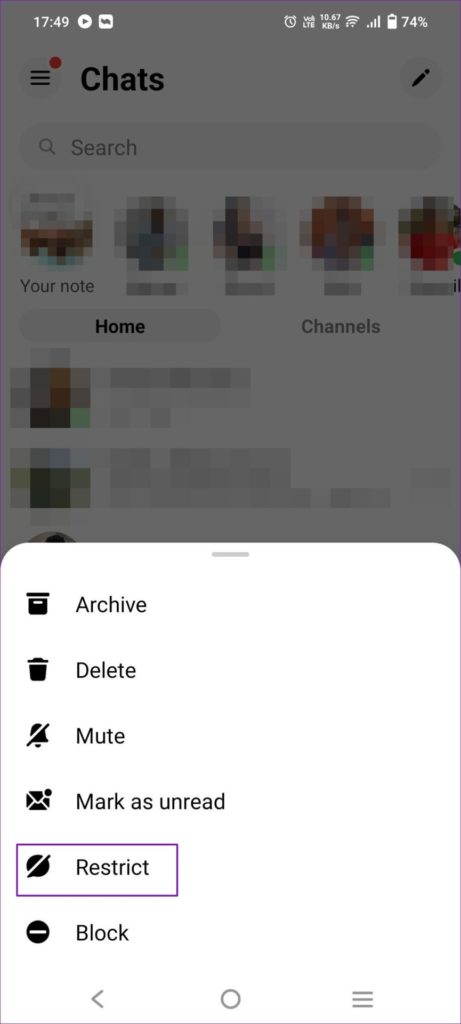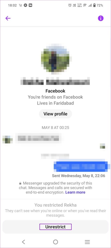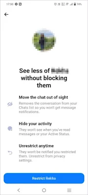 الخطوة 4: أخيرًا، انقر فوق تقييد <اسم الشخص> ، وستختفي الدردشة من الرسول.